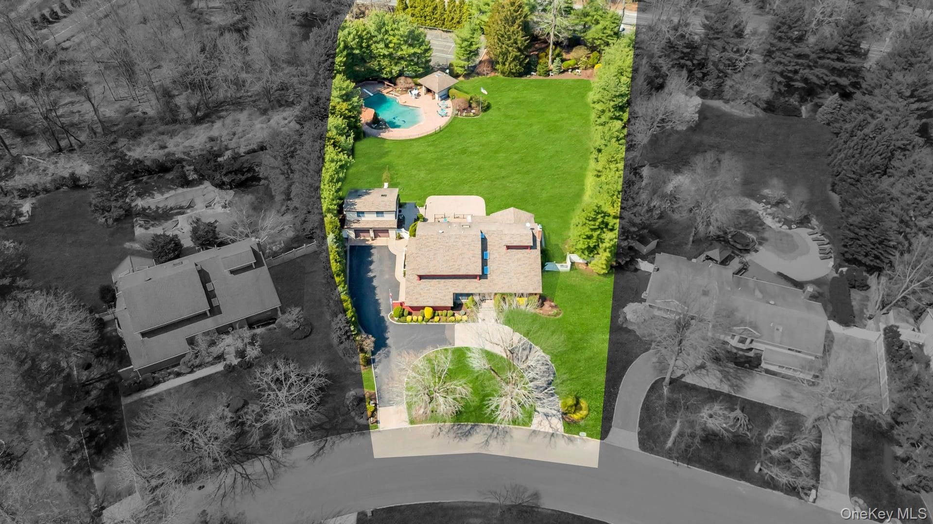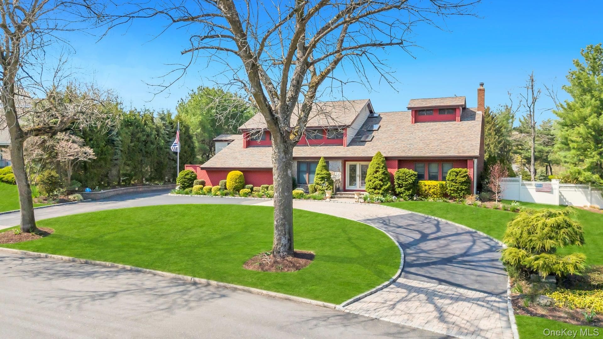 One of the largest and most spectacular properties in the sought-after West Hills section of Huntington, this breathtaking expanded Colonial sits on an oversized 1.34-acre estate and offers the ultimate luxury family compound lifestyle. Boasting more than 4,000 square feet of beautifully designed living space, this magnificent residence features 5 bedrooms, 4 full bathrooms, and 2 half bathrooms, with extraordinary indoor and outdoor living spaces built for entertaining, relaxation, and everyday comfort. From the moment you arrive, the curb appeal is undeniable with a sprawling horseshoe driveway framed by cobblestone borders, a stunning paver stone front entry, professionally manicured landscaping, and a striking partial stone facade. The property offers incredible functionality with a 4-car garage configuration including a 2-car attached garage with custom cabinetry and a separate 2-car detached garage complete with additional storage and a bonus loft space above. The backyard is a true private resort, featuring a heated gunite pool, an enormous paver patio, a full sports court designed for basketball and pickleball, and a spectacular pool house complete with a full bathroom, kitchen, and changing room. The outdoor living continues with an expansive Trex deck equipped with an electric awning, creating the perfect setting for large gatherings, outdoor dining, and unforgettable summer entertaining. The fully fenced pool oasis is surrounded by elegant metal fencing and offers a grand double-door entry. Inside, the home features an open floor plan with soaring vaulted ceilings, skylights, recessed lighting, and Anderson windows that flood the space with natural light. A welcoming formal living room with hardwood floors flows seamlessly into a spacious family room/den anchored by a gas brick fireplace. The living areas expand into a dramatic great room with vaulted ceilings, ceiling fans, floor-to-ceiling windows, and sliding doors that overlook the backyard retreat. At the center of the home is an exceptional chef's kitchen featuring granite countertops, custom oak cabinetry, tile backsplash, and an oversized center island with pendant lighting and seating. The kitchen is equipped with high-end appliances including double ovens, gas cooktop, built-in Samsung microwave, Samsung refrigerator, beverage refrigerator drawers, and extensive cabinet and counter space. A full laundry room with front-loading washer and dryer, folding station, and additional cabinetry adds everyday convenience. The first floor also
